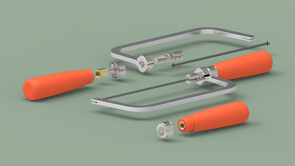 它有一個剛性金屬框架(平鋼)和一個木柄,用于精確模擬標準鋸片。 框架是由一個鋼帶(寬度10毫米,厚度5毫米) ,隨后彎曲,部分機加工和陽極氧化。 手柄有一個螺紋六角螺母,用于拉緊鋸片連接螺紋張緊螺栓,通過轉動手柄在順時針方向。