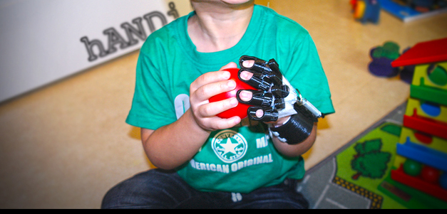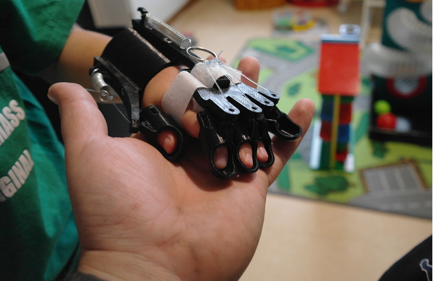為四歲痙攣型腦癱設計的輔具手,幫助手指握拳的痙攣型腦癱患兒,使其手指打開,抓握物體。