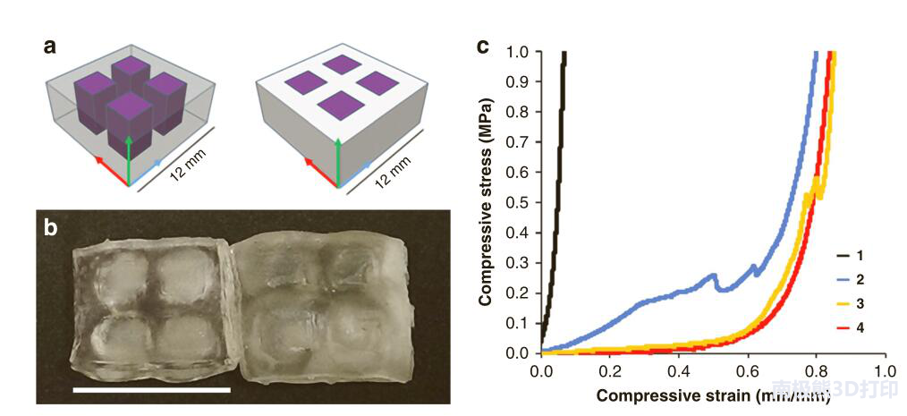 在光固化領域,威斯康星大學麥迪遜分校的科學家開發出一種新型3D打印機,它擁有可見光和紫外光兩種模式,可以同時打印多種光敏樹脂材料。該方法利用多材料光固化空間控制(MASC)技術,在增材制造過程中根據不同的材料化學成分選擇不同的光源波長。多組分光敏素包括具有相應的自由基和陽離子引發劑的丙烯酸酯和環氧化物基單體。在長波長(可見光)照射下,觀察到丙烯酸酯組分的優先固化。在短波長(UV)照射下,摻入丙烯酸酯和環氧化物組分的組合優先固化。這使得能夠生產含有硬質環氧化物網絡的多材料部件,與軟水凝膠和有機凝膠形成對比。 MASC配方的變化極大地改變了打印樣品的機械性能。使用不同MASC配方打印的樣品具有空間控制的化學不均勻性,機械各向異性和空間控制的膨脹。圖1為使用BA-1 MASC制劑打印的樣品的壓縮測試應變圖,表1為光敏樹脂配方。