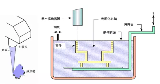 SLA是"Stereo Lithography Apparatus"的縮寫,激光束在液態光敏樹脂表面勾畫出物體的第一層形狀,然后制作平臺下降一定的距離,再讓固化層浸入液態樹脂中,如此反復直到打印成型。最后,將原型從樹脂中取出后,進行最終固化,再經打光、電鍍、噴漆或著色處理即得到要求的產品。